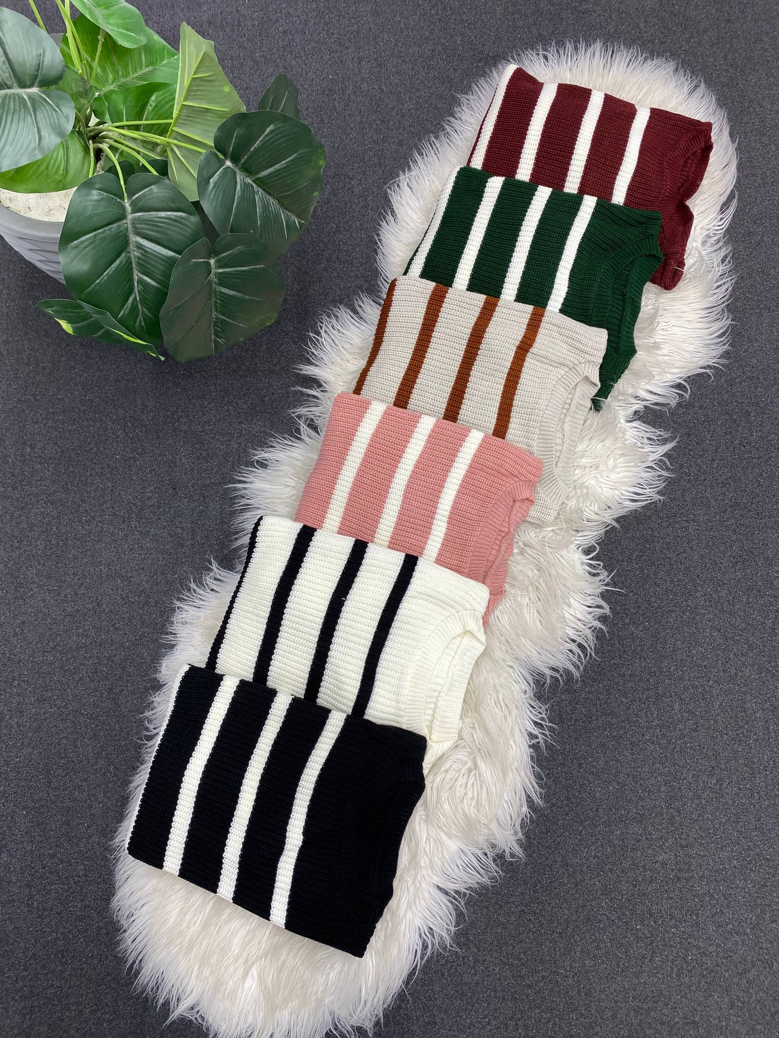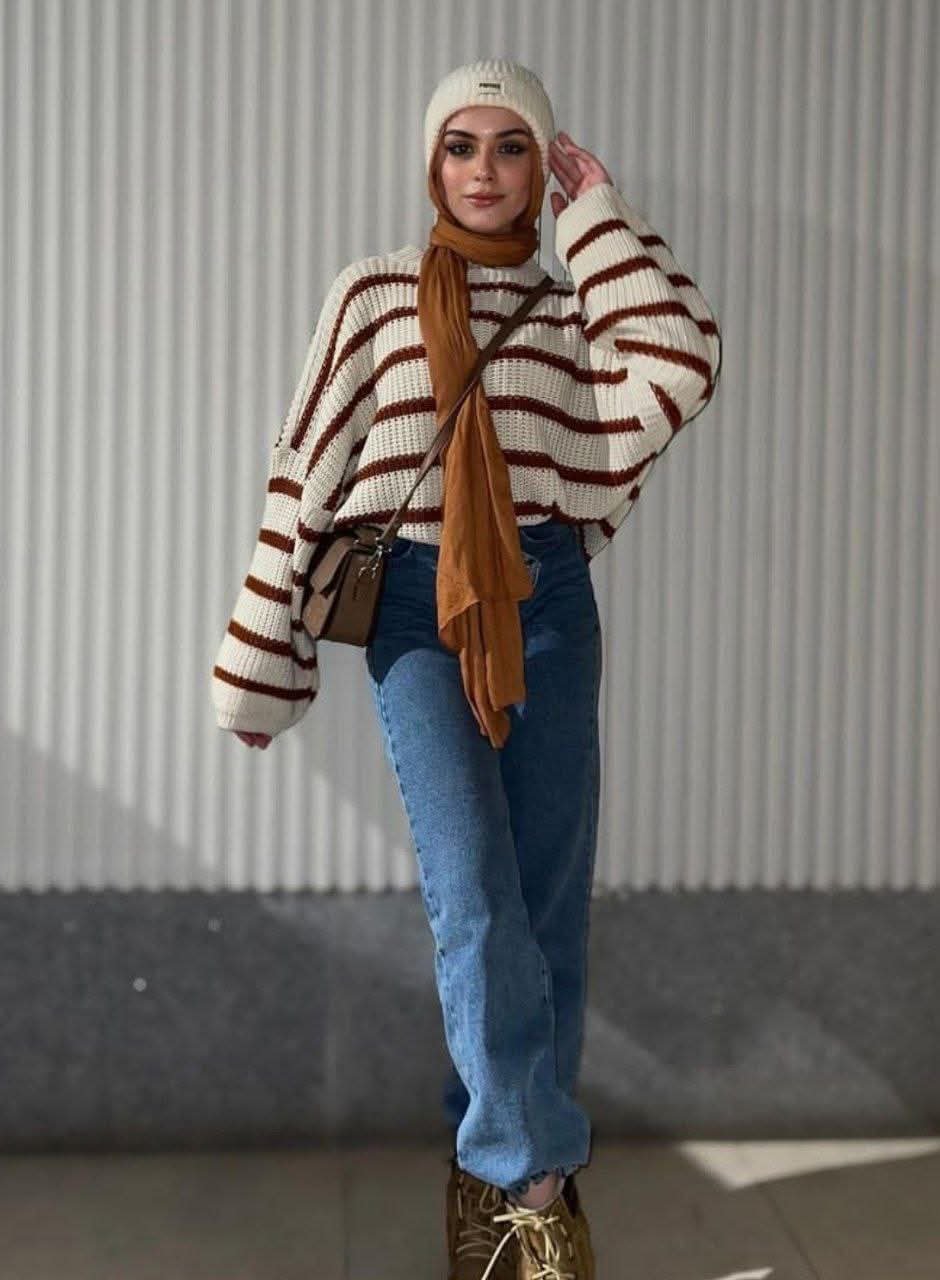 بلوزة تريكو مخططة استمتعي بأعلى مستويات الدفء والراحة مع هذه البلوزة الشتوية الفضفاضة التي تتبع أحدث صيحات الموضة. تصميمها المريح يسمح بحرية الحركة ودفء لا يقاوم، مما يجعلها الخيار المثالي لإطلالة شتوية عصرية ومحتشمة.  تصميم بقصة واسعة ومريحة تمنحك إحساساً بالاسترخاء وتناسب مختلف أشكال الجسم. هذه القصة عصرية للغاية وتسمح بالتنسيق بسهولة فوق طبقات داخلية خفيفة كما تتميز بأكمام طويلة واسعة و”منفوخة” قليلاً عند الكتف (Puff/Balloon Sleeves)، والتي تضيق عند المعصم، مما يضفي عليها شكلاً جمالياً مميزاً وعصرياً. وياقة بسيطة ومريحة (Crew Neck) تسمح لك بارتداء الشالات أو الأوشحة (كما في الصورة) أو القمصان ذات الياقات أسفلها. طول مناسب (غالباً يصل إلى الخصر أو يغطيه قليلاً)، مثالي للتنسيق مع السراويل ذات الخصر العالي أو إدخالها جزئياً في البنطال (Tucking).