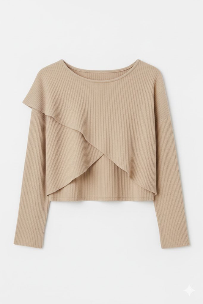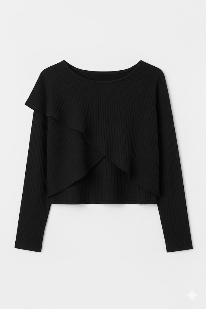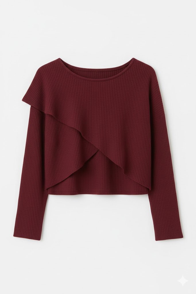 بلوزة “شيك” بتصميمها المبتكر وقصتها الأنيقة. تتميز البلوزة بقصة كروب ناعمة ومريحة، وبكسرة أمامية متقاطعة (Wrap/Cross-over detail) تضفي لمسة فخامة وجاذبية فريدة على مظهرك.